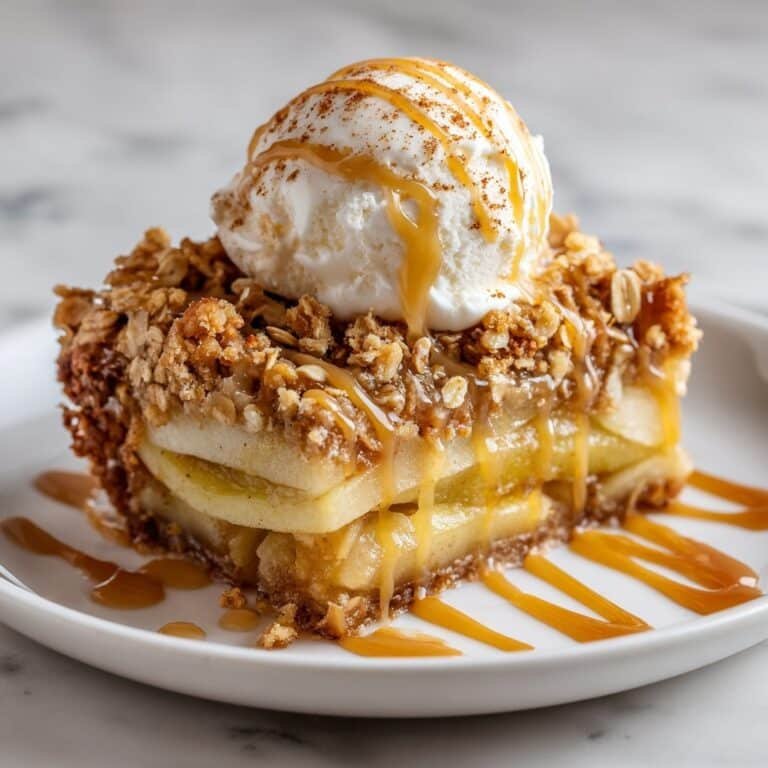 A classic Apple Crisp recipe featuring a tender, cinnamon-spiced apple filling topped with a buttery oat crumble. Baked to golden perfection and served warm with creamy vanilla ice cream and optional caramel sauce for a comforting dessert.