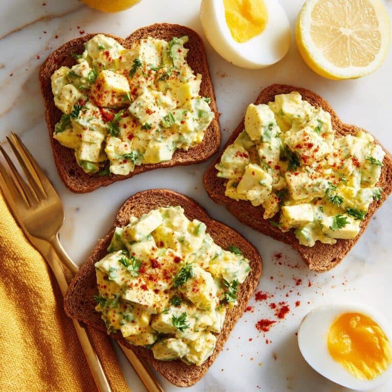A delicious and nutritious avocado salad toast featuring creamy mashed avocado mixed with chopped hard-boiled eggs, seasoned with Dijon mustard, lemon juice, smoked paprika, salt, and pepper, served on toasted wholemeal bread for a perfect crunchy finish.