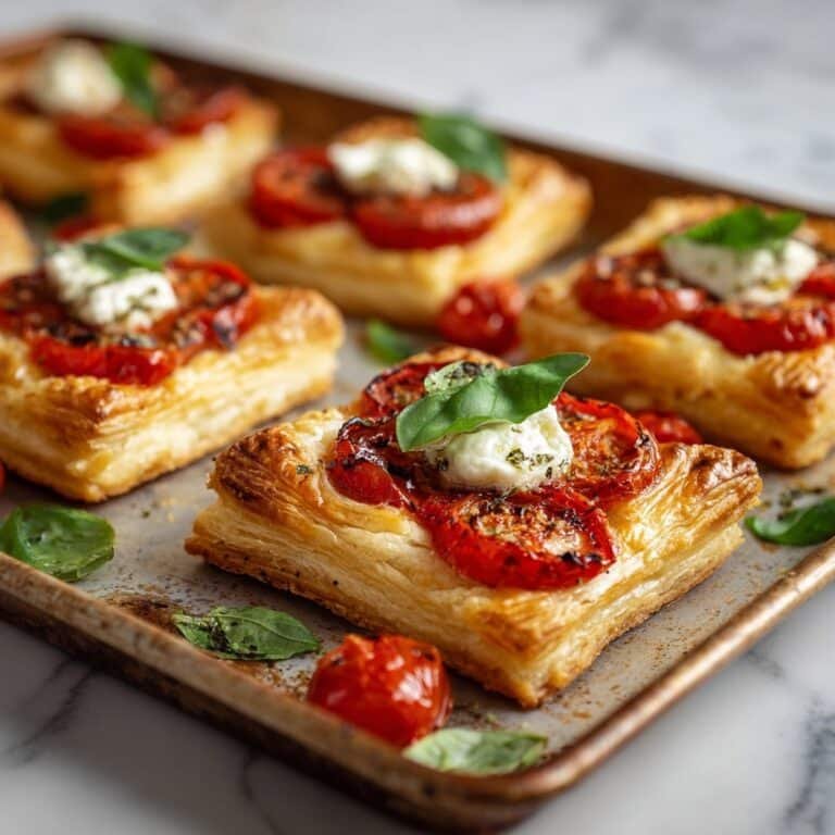 Baked Feta Pasta Bites are a delicious and easy appetizer or snack featuring a creamy baked feta and cherry tomato mixture combined with pasta, wrapped in flaky puff pastry, and baked to golden perfection. Garnished with fresh basil, these bite-sized treats offer a flavorful and convenient way to enjoy the popular baked feta pasta trend.