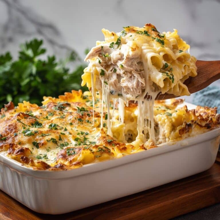 A comforting and flavorful Banana Pepper Chicken Alfredo Bake featuring tender chicken, creamy Alfredo sauce, and a spicy kick from banana peppers, baked to golden perfection with mozzarella and Parmesan cheese.