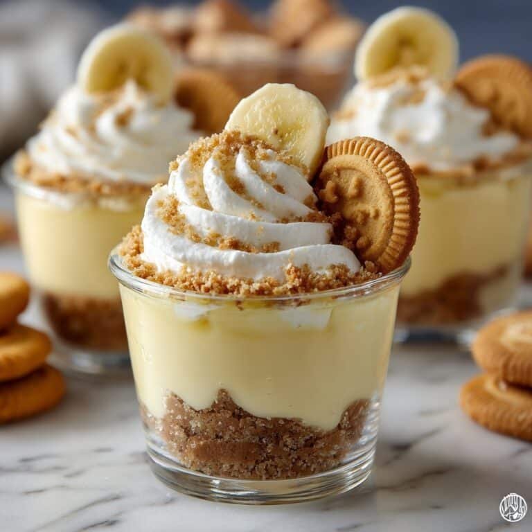 These Banana Pudding Shots are a fun and delicious dessert perfect for parties. Creamy banana pudding mixed with whipped topping and a splash of whipped cream vodka is layered with crushed Nilla Wafers and garnished with banana slices for a delightful bite-sized treat.