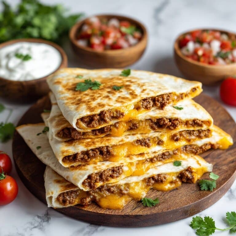 This Beef and Cheese Quesadillas recipe is a quick and delicious meal featuring seasoned ground beef and melted cheese folded inside warm flour tortillas. Perfect for a satisfying lunch or dinner, these quesadillas are served with salsa and sour cream for added flavor.