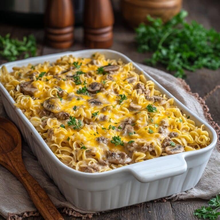 A comforting and hearty beef and noodle casserole combining ground beef, creamy mushroom soup, and cheddar cheese baked to perfection. This easy-to-make dish is perfect for a satisfying family dinner.