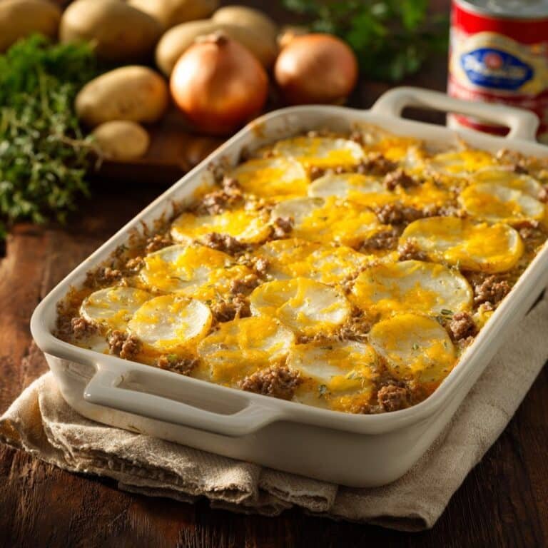 A hearty and comforting beef and potato casserole layered with seasoned ground beef, tender potatoes, and a creamy mushroom sauce, topped with melted cheddar cheese. Perfect for a satisfying family dinner.