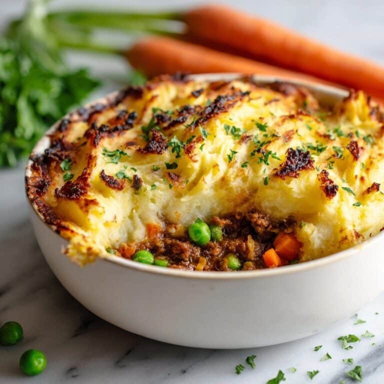 A classic Beef Shepherd’s Pie featuring a savory ground beef and vegetable filling topped with creamy mashed potatoes baked to golden perfection.
