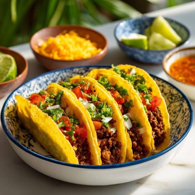 Classic Beef Tacos featuring seasoned ground beef served in crispy taco shells topped with fresh lettuce, diced tomato, shredded cheddar cheese, and salsa. A quick and satisfying meal perfect for any day of the week.
