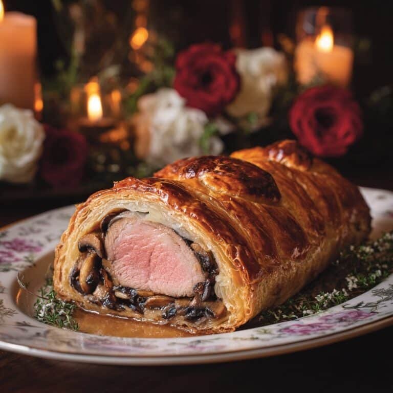 A classic Beef Wellington featuring a tender seared beef tenderloin coated with a flavorful mushroom duxelles and prosciutto, all wrapped in flaky puff pastry and baked to golden perfection. Perfect for an impressive main course dinner.