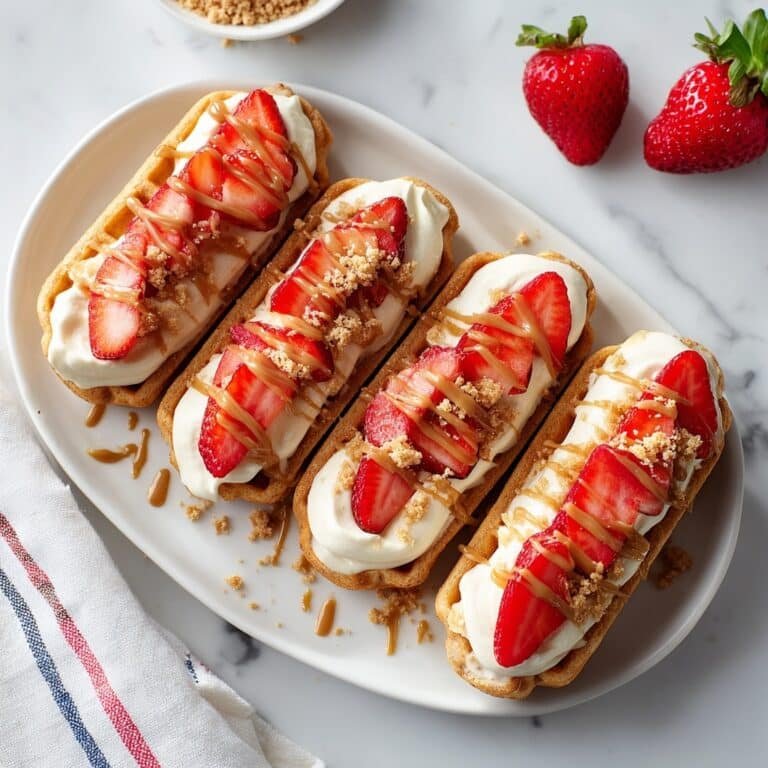 Assemble and Serve: While the croffles are still warm, top each with a generous dollop of Biscoff whipped cream. Add fresh sliced strawberries on top, drizzle with extra melted Biscoff spread, and finish by sprinkling crushed Biscoff cookies over everything.