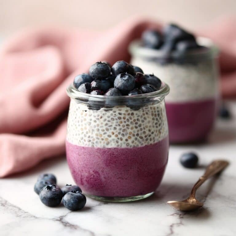 This Blueberry Chia Seed Pudding is a refreshing and nutritious vegan dessert or breakfast option. Made with chia seeds soaked in plant-based milk, sweetened with maple syrup, and layered with creamy blueberry-infused vegan yogurt and fresh blueberries, it offers a delightful blend of textures and flavors that's both healthy and satisfying.