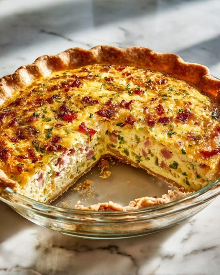 A savory and comforting quiche featuring a crispy hash brown crust filled with a flavorful mixture of ham, sharp cheddar, roasted red peppers, green onions, and bacon. Perfect for brunch or a hearty breakfast, this quiche delivers a delicious combination of textures and bold flavors.