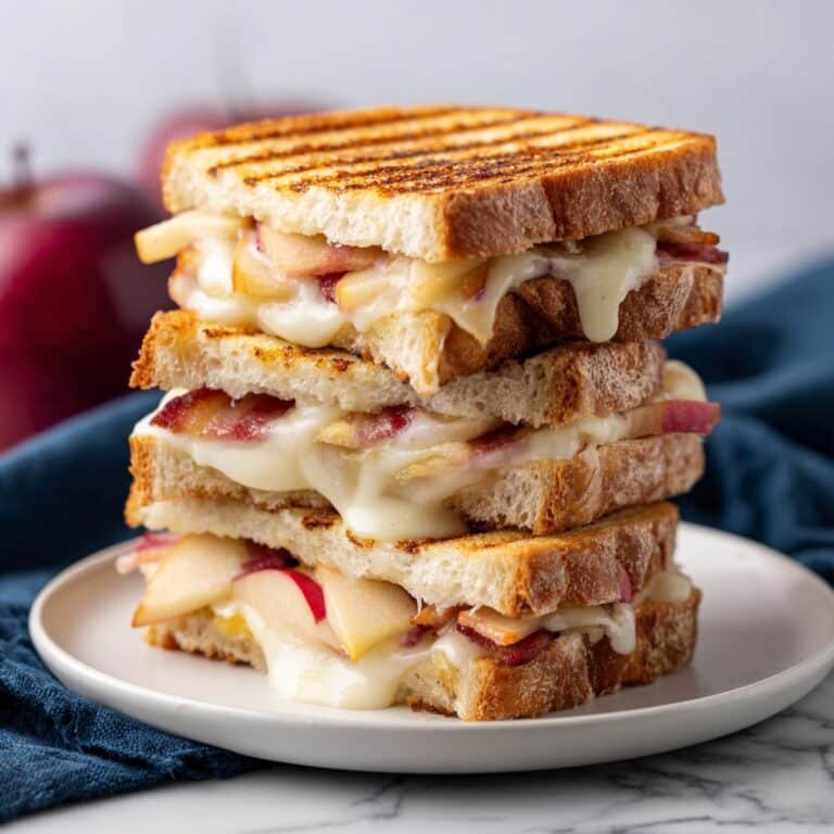 A delicious brunch panini featuring creamy Brie cheese, crispy bacon, sweet apple slices, and a drizzle of honey, grilled to golden perfection for a warm, flavorful sandwich.