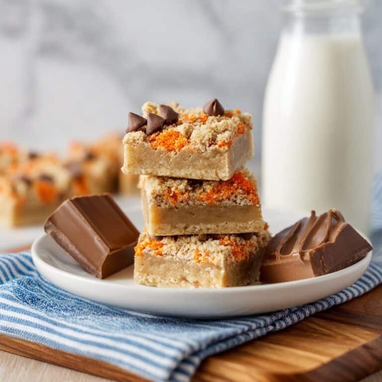 Delicious Butterfinger Cookie Bars featuring a soft and chewy cookie base loaded with chopped Butterfinger bars, topped with a creamy peanut butter frosting and more crunchy Butterfinger pieces for an irresistible treat.