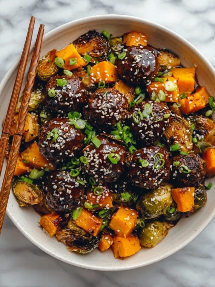 Korean BBQ Meatballs with Roasted Vegetables Recipe