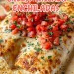Delicious Cheesy Chicken Enchiladas with a rich and creamy sauce, baked to golden perfection and garnished with fresh salsa and cilantro, perfect for a comforting dinner.