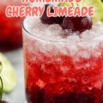 A refreshing and vibrant Cherry Limeade made with fresh cherries, freshly squeezed lime juice, and simple syrup, topped with sparkling water and served over ice with garnishes of lime wedges and cherries. Perfect for a cool and tangy beverage on a warm day.