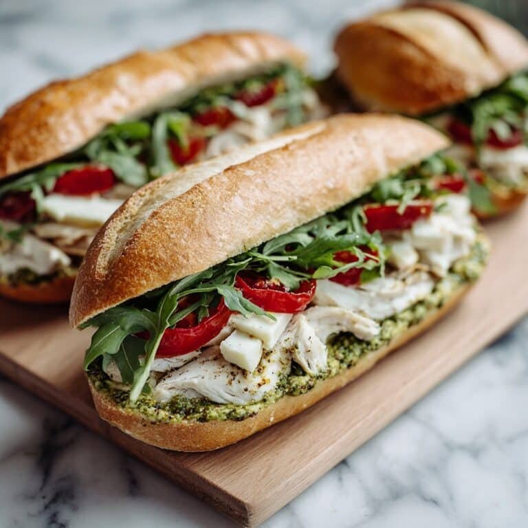 A delicious Chicken Walnut Pesto Sandwich featuring grilled chicken tossed in a rich walnut basil pesto, layered with fresh mozzarella, tomato, and arugula, served on a toasted sourdough baguette for a flavorful and satisfying meal.