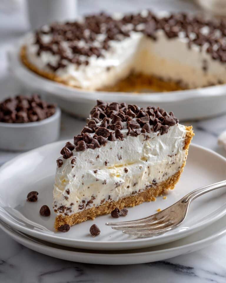 A decadent Chocolate Chip Cannoli Pie featuring a crispy vanilla wafer crust filled with a creamy mascarpone and ricotta filling, infused with vanilla, cinnamon, and lemon zest, and studded with mini chocolate chips. Perfect for a delightful dessert that's sure to impress.