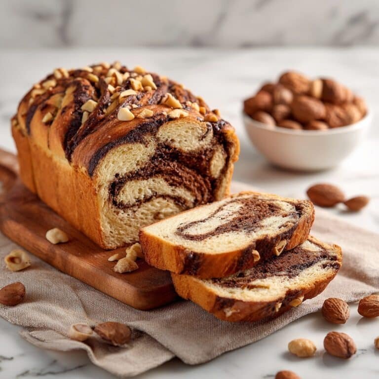 This decadent Chocolate Hazelnut Babka features a rich, soft dough swirled with a luscious dark chocolate and hazelnut filling. Topped with a glossy vanilla sugar syrup, this classic Eastern European bread is perfect for special breakfasts, brunches, or dessert indulgences.