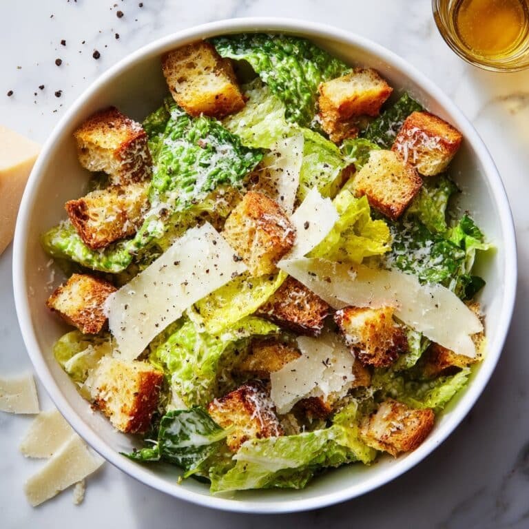 A Classic Caesar Salad featuring crisp romaine lettuce, crunchy croutons, tangy Caesar dressing, and freshly grated Parmesan cheese for a timeless and refreshing appetizer or side dish.