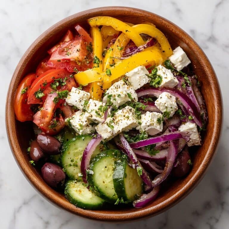 A refreshing and authentic Classic Greek Salad featuring crisp cucumbers, juicy tomatoes, crunchy bell peppers, tangy Kalamata olives, and creamy feta cheese, all dressed in a simple oregano and red wine vinegar dressing. Perfect as a light meal or a flavorful side dish.