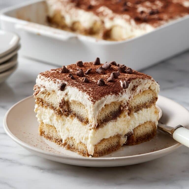 Classic Tiramisu is a creamy Italian dessert featuring layers of espresso-soaked ladyfingers and a rich mascarpone mixture, topped with cocoa powder and dark chocolate shavings. This no-bake dessert is smooth, indulgent, and perfect for special occasions or an elegant treat.
