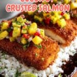 Steamed jasmine rice, quinoa, or a crisp green salad all complement this dish beautifully, adding texture and freshness to balance the rich crust and fruity salsa.