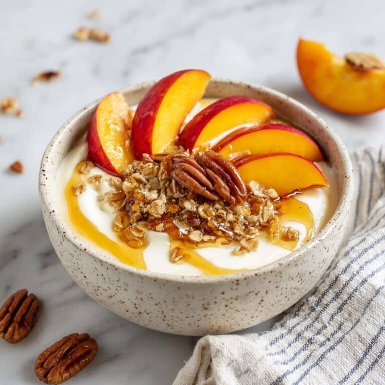 A refreshing and nutritious Cottage Cheese Peach Cobbler Bowl combining creamy cottage cheese, crunchy granola, fresh fruit, and optional nuts and seeds for a wholesome breakfast or snack.