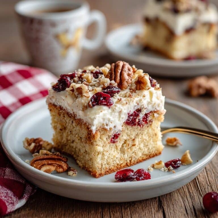This Cranberry Sauce Poke Cake with Whipped Topping is a festive and moist dessert perfect for holiday gatherings. A spiced yellow cake base is baked and then poked to allow whole berry cranberry sauce to seep in, creating a flavorful, tangy surprise in every bite. Topped with smooth whipped topping, dried cranberries, and crunchy walnuts, this cake combines traditional holiday flavors in a simple yet elegant way.