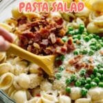 A delicious and creamy pea and bacon pasta salad combining tender pasta shells, crispy bacon, fresh peas, and a tangy homemade dressing, perfect for a chilled side dish or light meal.