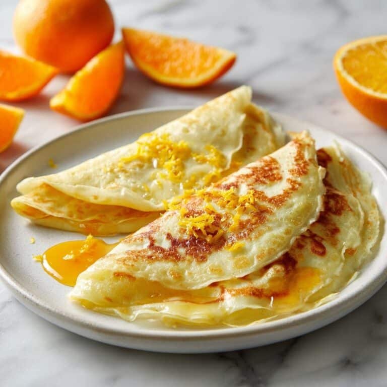 Crêpes Suzette is a classic French dessert featuring delicate thin pancakes served with a luscious orange-flavored buttery sauce flambéed with Grand Marnier. This elegant treat combines tender crêpes with a zesty, caramelized citrus sauce for a memorable finish to any meal.