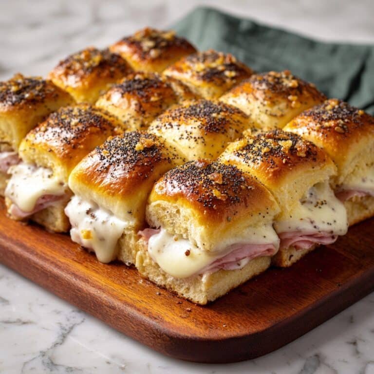 These delicious Ham & Cheese Sliders are perfect for gatherings or a tasty snack. Featuring tender ham and melted Swiss cheese nestled inside soft Hawaiian rolls, topped with a flavorful buttery glaze of Dijon mustard, onion, and poppy seeds, then baked to golden perfection.