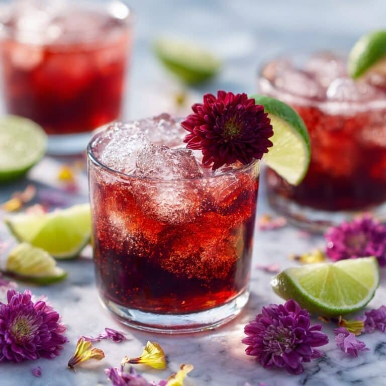 A refreshing and vibrant Hibiscus Iced Tea Cooler made with brewed hibiscus tea, fresh lime juice, and a touch of honey or agave syrup, topped with sparkling water and garnished with lime slices and edible flowers. Perfect for a cooling beverage on a warm day.