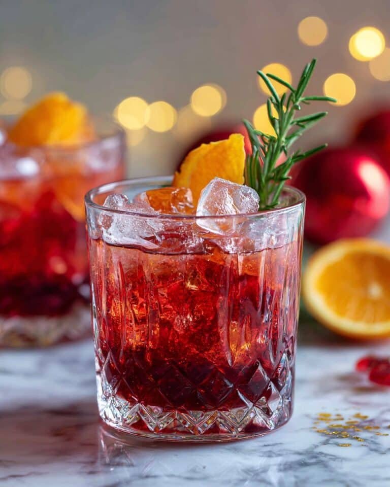 Garnish and Serve: Garnish each cocktail with a twist of orange peel and a fresh sprig of rosemary to enhance the aroma and add a festive visual appeal before serving.