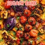 This Homemade Butternut Squash Bake is a delicious and hearty dish featuring roasted butternut squash, sweet cherry tomatoes, and red onions combined with tender orzo pasta, all topped with savory halloumi cheese and vibrant pesto. It's a perfect vegetarian main course that brings warmth and flavor to any meal.