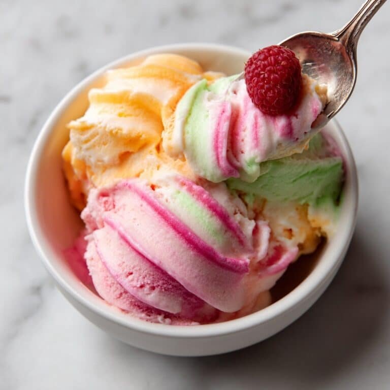 Homemade Rainbow Sherbet is a refreshing, colorful frozen dessert made with cream, milk, fresh fruit juices, and raspberries. This recipe features vibrant layers of raspberry, lime, and orange flavors creating a delightful sweet and tangy treat perfect for warm weather or anytime you crave a fruity ice cream alternative.