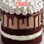 A rich and decadent hot chocolate cake featuring moist chocolate layers, a creamy hot chocolate buttercream frosting, a fluffy marshmallow filling, and a luscious white chocolate ganache topping, finished with a ring of marshmallows and vanilla buttercream for a festive touch.