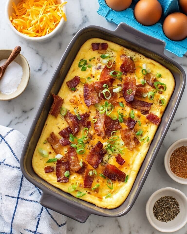 A delicious and satisfying keto-friendly breakfast casserole combining eggs, crispy bacon, and cheddar cheese, perfect for a hearty morning meal or brunch.