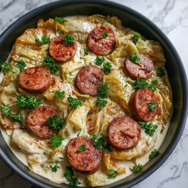 A flavorful keto-friendly dish featuring spicy Cajun andouille sausage combined with tender sautéed cabbage in a creamy Alfredo sauce made from butter, heavy cream, and Parmesan cheese. This low-carb meal is perfect for a quick and satisfying dinner.
