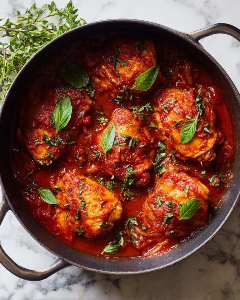 Garnish and serve: Once cooked, serve the chicken cacciatore hot, garnished with fresh basil leaves for a burst of freshness and added aroma.