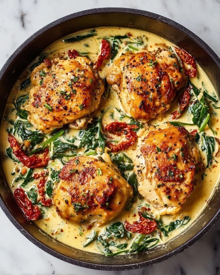 This Keto Creamy Tuscan Chicken recipe features tender chicken thighs slow-cooked to perfection in a rich and flavorful sauce made with heavy cream, chicken broth, spinach, sun-dried tomatoes, and Italian seasoning. Topped with grated Parmesan cheese, it’s a satisfying low-carb meal perfect for a cozy dinner.