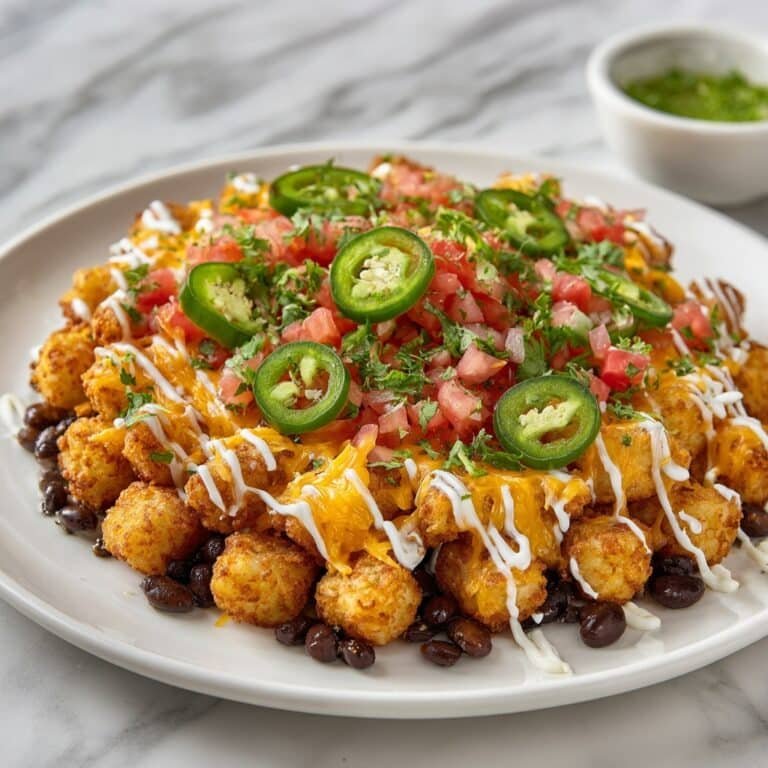 Loaded Tater Tot Nachos are a delicious and easy-to-make appetizer featuring crispy baked tater tots topped with melted cheese, black beans, jalapeños, diced tomatoes, sour cream, and green onions. This crowd-pleaser combines the comfort of tater tots with the vibrant flavors of classic nacho ingredients, perfect for game day or casual gatherings.