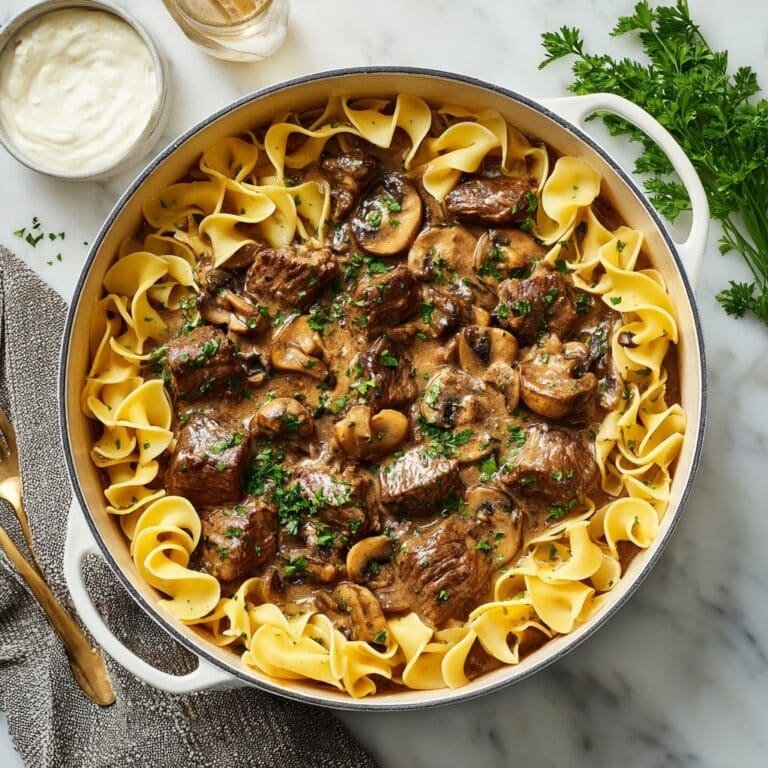 A creamy and comforting one-pot beef stroganoff that combines tender slices of beef sirloin, sautéed mushrooms, and egg noodles in a flavorful sauce enriched with sour cream. Perfect for an easy weeknight dinner with minimal cleanup.