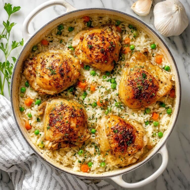 A hearty and flavorful one-pot chicken and rice dish featuring tender chicken thighs, savory spices, and a medley of vegetables, perfect for an easy and satisfying meal.