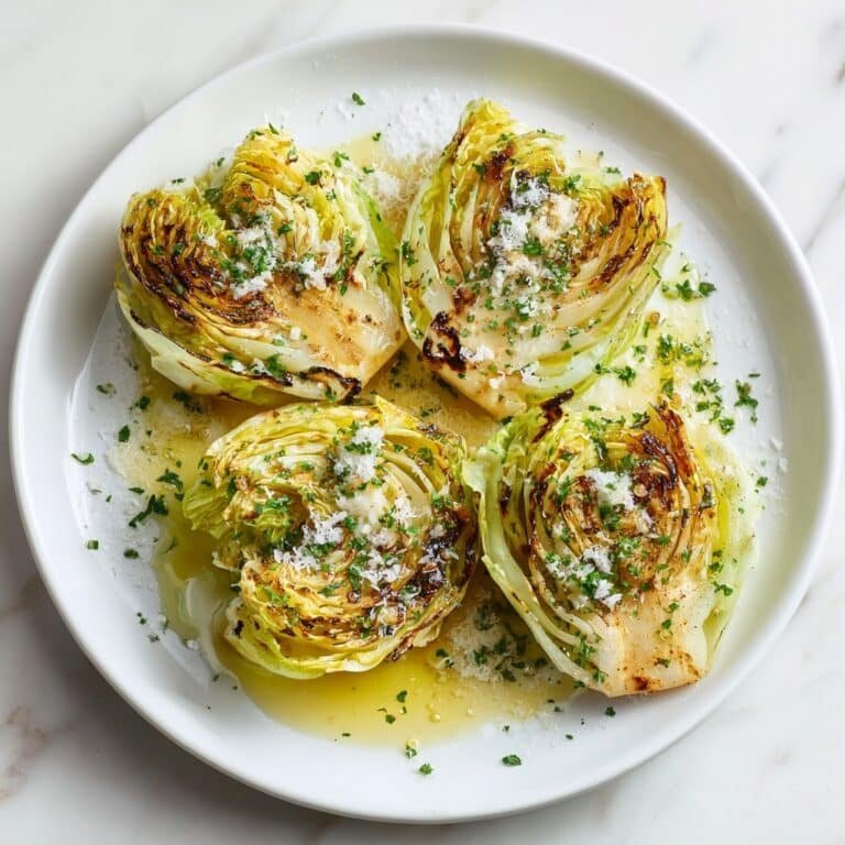 Melted Cabbage is a deliciously caramelized roasted cabbage dish featuring a buttery garlic glaze, finished with Parmesan cheese and fresh parsley for a flavorful and easy side.