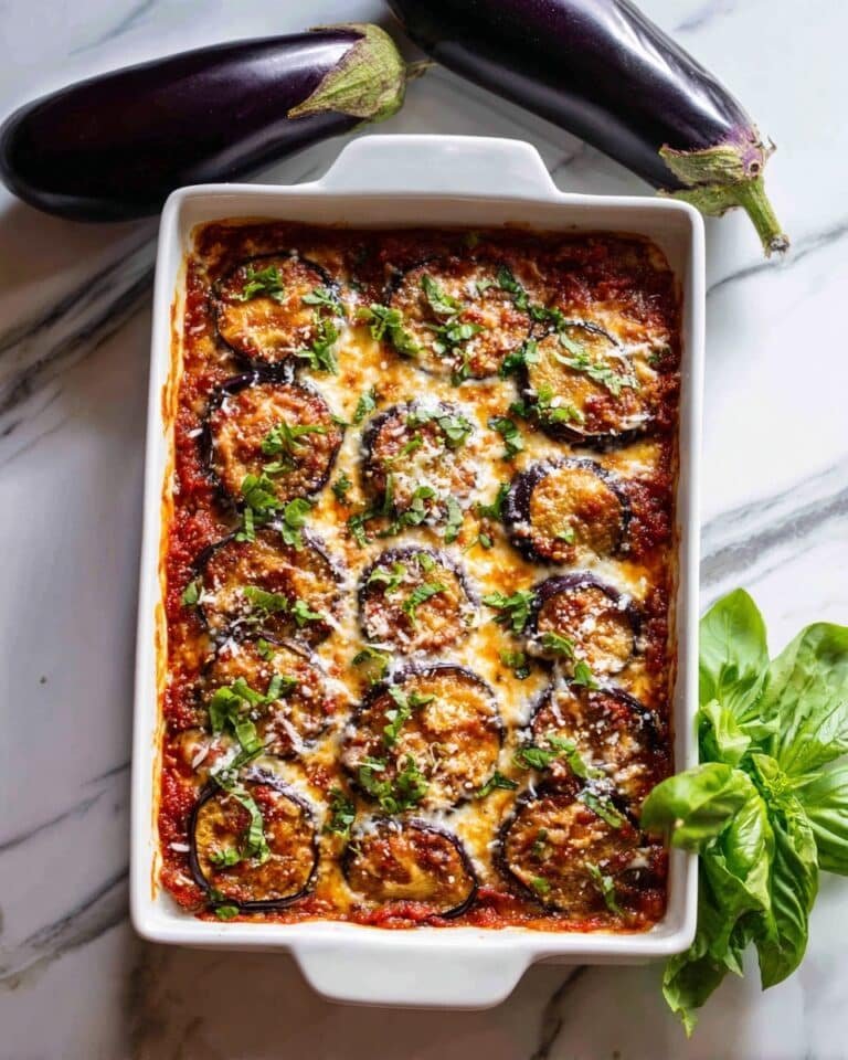 Assemble lasagna: Brush a baking dish with olive oil to prevent sticking. Begin layering by placing eggplant slices on the bottom, then spread half of the meat sauce over them, followed by half of the ricotta mixture, and a layer of shredded mozzarella cheese. Repeat these layers, ending with mozzarella and the remaining Parmesan cheese on top.