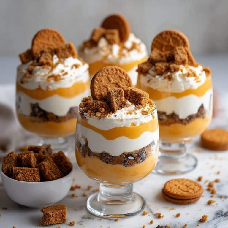 Delightfully layered Pumpkin Cheesecake Mini Trifles combine soft pumpkin bread, creamy pumpkin cheesecake filling, and crunchy ginger snap cookies topped with whipped cream, perfect for a festive and easy dessert.