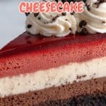 This Red Velvet Oreo Cheesecake features a rich Oreo crust layered with creamy red velvet and vanilla cheesecake layers, topped with a smooth chocolate ganache. Perfectly balanced in flavors and textures, this decadent dessert is garnished with whipped cream and extra Oreos for a stunning presentation.
