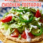 A quick and delicious recipe for Rotisserie Chicken Tostadas featuring crispy corn tortillas topped with re-fried beans, shredded rotisserie chicken, fresh lettuce, tomatoes, and your favorite Mexican-style toppings like cream, cheese, and avocado.
