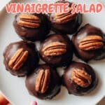 - Dip and decorate: Dip each firm pecan pie bite into the melted chocolate to coat. Place back on the cookie sheet and top each bite with an extra pecan half.