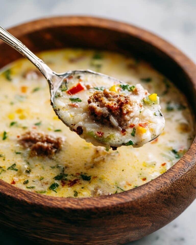 A comforting and flavorful Savory Orzo Stuffed Banana Peppers Soup featuring a rich blend of Italian sausage, aromatic herbs, creamy cheeses, and diced banana peppers simmered in a chicken broth base with orzo pasta.